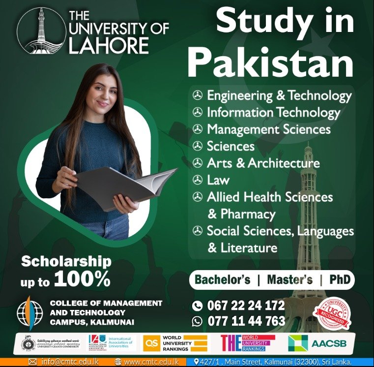 Take the first step towards a brighter future. Join us at CMT College, Kalmunai, and take advantage of this unique opportunity to study at the University of Lahore, with significant financial support.